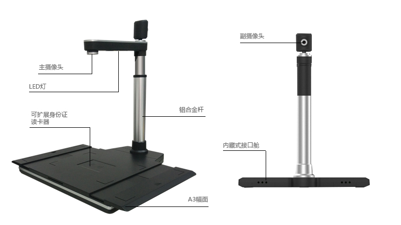 9.底座A4幅面,支持可向外左右侧滑拓展A3幅面拍摄托盘,保证A3幅面资料放置平整,不致使拍摄图像畸形;