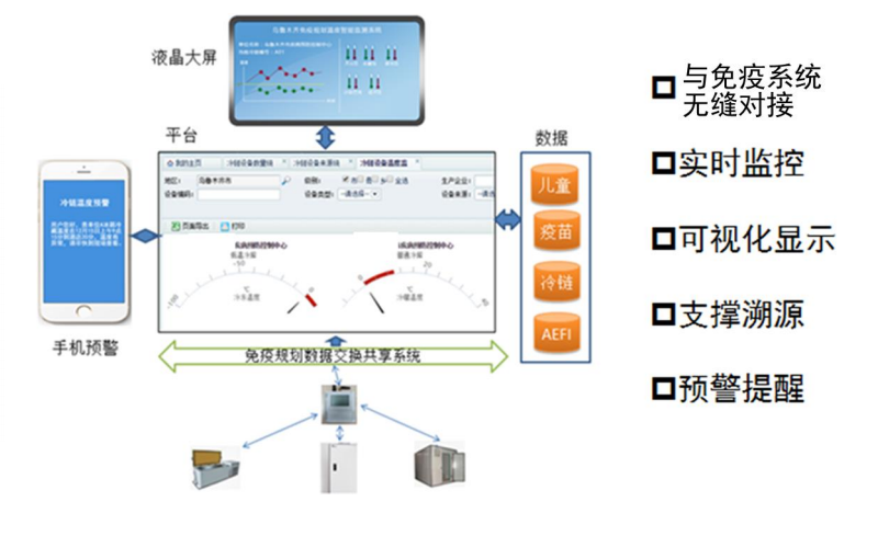 冷链监管服务系统提供数据称采集、数据传输、数据显示、预警提示、远程控制等客户端功能模块,构建全方位的门诊冷链实时监测网络。支持短信、微信、APP、电话语音多渠道预警。
