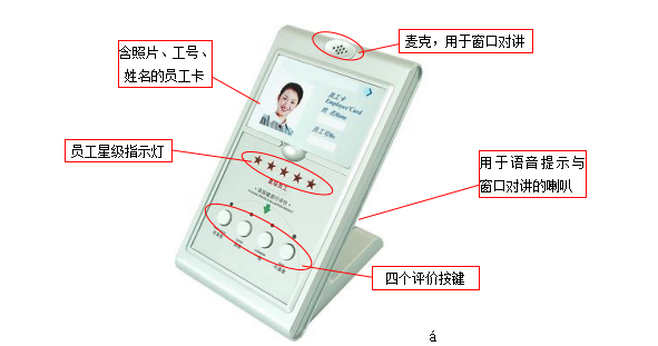 ★评价器上通过星级指示灯可显示当前员工的星级(每个星级亮一盏指示灯,分1-5几个级别)。员工的星级评定可以直接通过后台服务器评定。