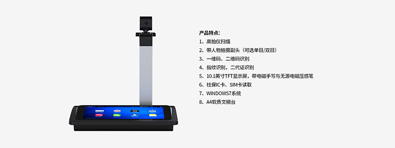 ※ 专业高拍仪扫描设备 ※ 带人物拍摄副头 ※ 条码、二维码扫码 ※ 指纹识别,更安全更可靠 ※ 二代证识别,简单快捷办公 ※ 电磁显示屏与无源电磁压感笔 ※ 电磁显示屏与文稿拍摄仪完美结合,节约柜台空间